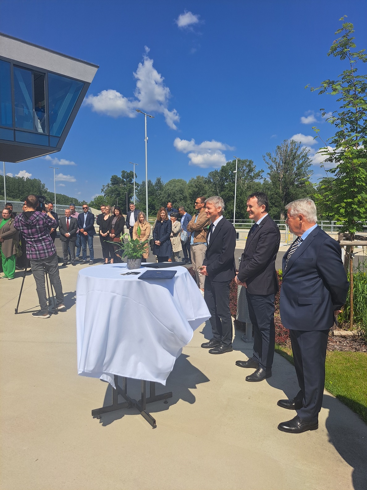 Az ünnepséget Kara Ákos miniszteri biztos köszöntője nyitotta, majd a műtárgy generálkivitelezőinek képviseletében Sopronyi László, területi főmérnök tartotta meg beszédét. Ezt követően a projekt tervezőinek képviseletében Benedek András ügyvezető, és Tolnay Tibor, az Építőipari Nívódíj Bíráló Bizottság elnöke méltatták a projektet. Az emléktábla ünnepélyes leleplezése után végül Németh József, az Észak-dunántúli Vízügyi Igazgatóság igazgatójának pohárköszöntőjére került sor, melynek keretében megköszönte az alkotók munkáját, és kiemelte a projekt fontosságát.