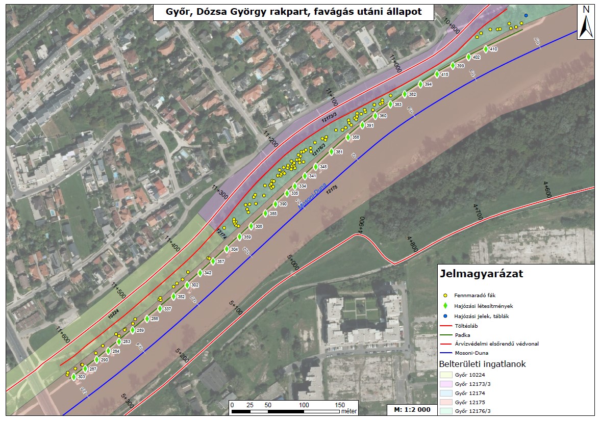 c.) Ingatlan-nyilvántartásilag: A Magyar Állam tulajdonában és az ÉDUVIZIG vagyonkezelésében lévő Győr 10224 (kivett töltés), Győr 12173/3 (kivett töltés), Győr 12174 (kivett csatorna), Győr 12175 (kivett Mosoni-Duna), Győr 12176/3 (kivett töltés) hrsz-ú ingatlanoknak az a), ill. a b) pontban lehatárolt részterülete.