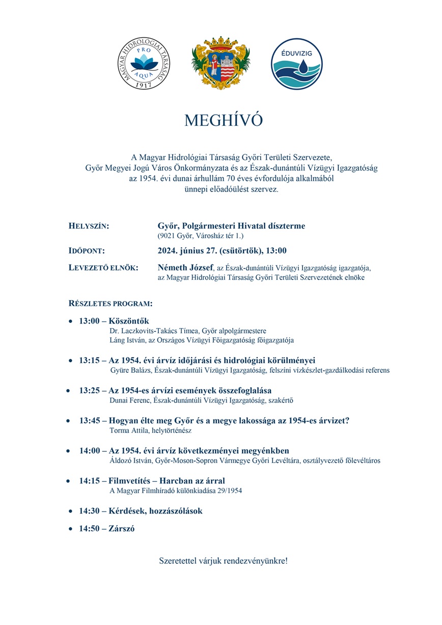A Magyar Hidrológiai Társaság (MHT) Győri Területi Szervezete, Győr Megyei Jogú Város Önkormányzata és az Észak-dunántúli Vízügyi Igazgatóság az 1954. évi dunai árvíz 70 éves évfordulója alkalmából közös ünnepi megemlékezést tart 2024. június 27-én 13 órától a győri Polgármesteri Hivatal dísztermében.