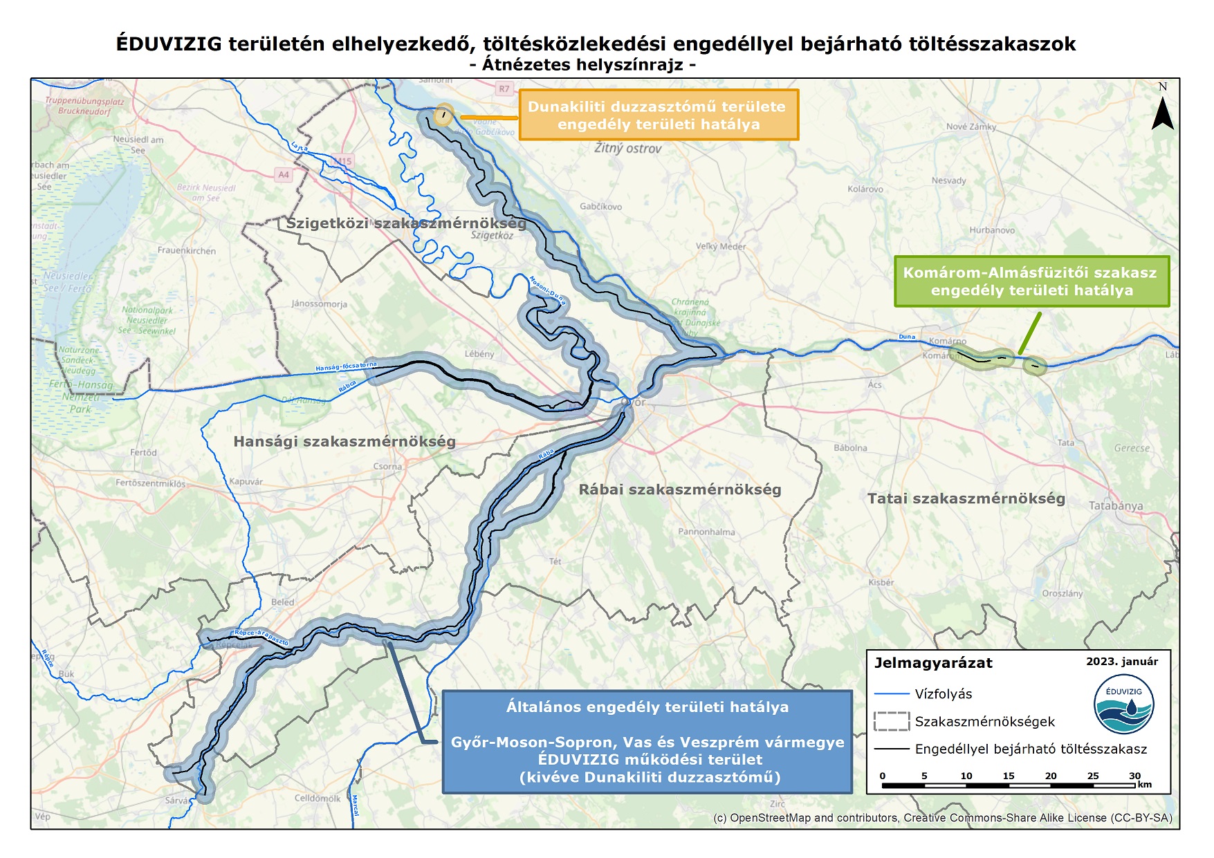 Az ÉDUVIZIG működési területén érvényes engedély birtokában közlekedésre igénybe vehető töltéskorona szakaszok az alábbiak, melyeket a mellékelt térképes formában is megjelenítettük: