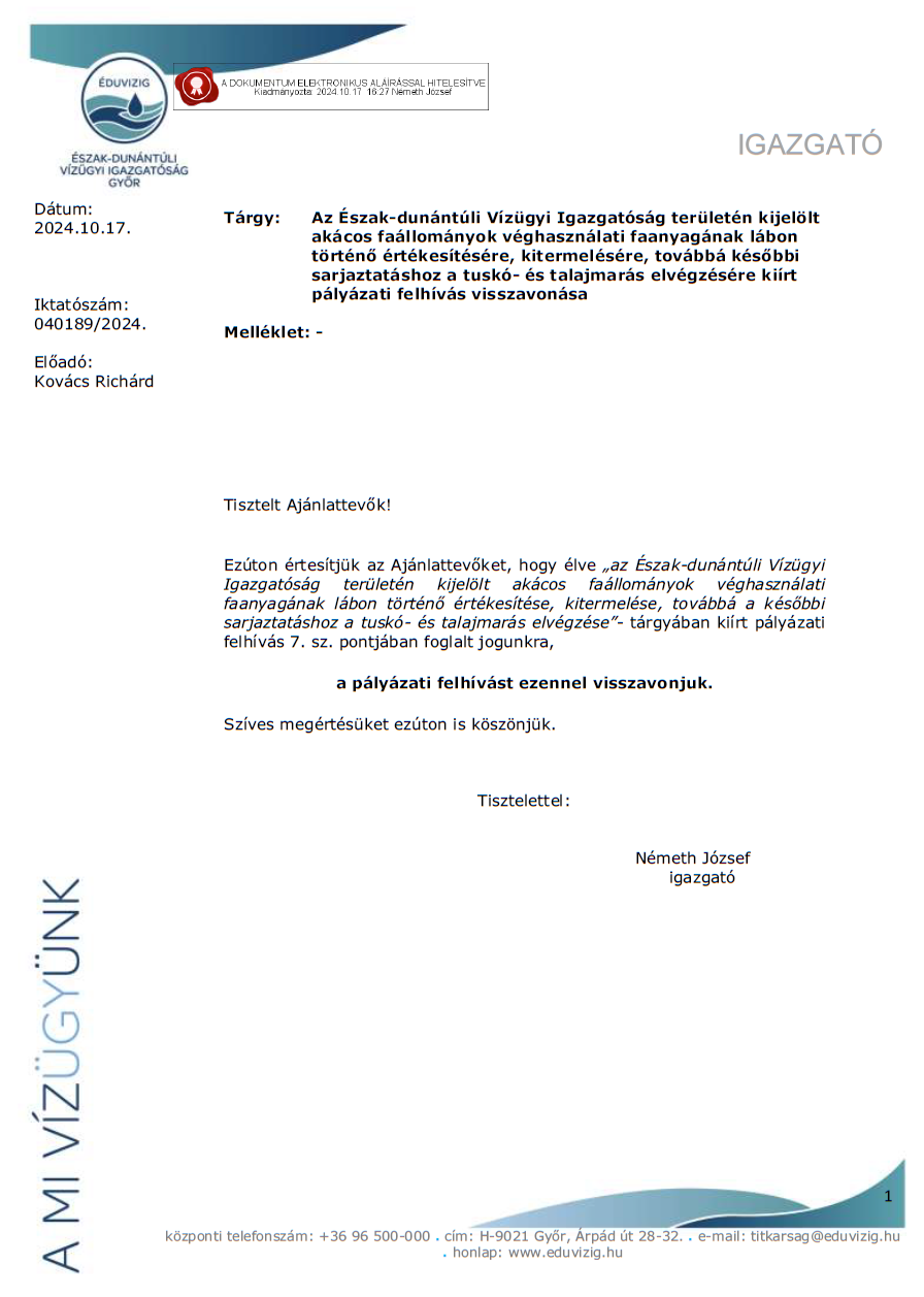 Az Észak-dunántúli Vízügyi Igazgatóság területén kijelölt akácos faállományok véghasználati faanyagának lábon történő értékesítésére, kitermelésére, továbbá későbbi sarjaztatáshoz a tuskó- és talajmarás elvégzésére kiírt pályázati felhívás visszavonása